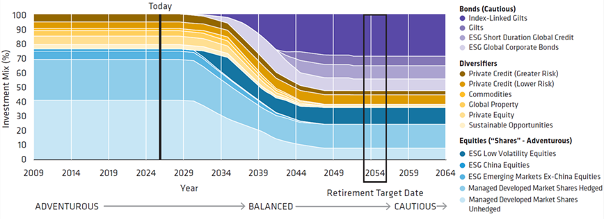 The example TDF below maps how your investment mix changes as you move through the three main life stages towards retirement.